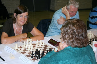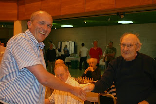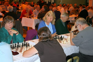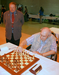 Old Fashioned Generosity: The draw in the Seniors paired club-mates Brian Gosling and David Toms (see earlier picture), who both play for Sidmouth in local leagues and Exmouth in the county leagues. It also happened to be David’s birthday, so Brian gave him the best present of all - the gift of a piece during the game and the full point. Isn’t that what friends are for?