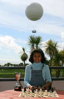 Players from all quarters of the UK plus a few from Gibraltar, Russia, Australia et. al. have come to Torquay to play in one or other of the 22 sections of the British Chess Championships. Yet few can have had a shorter journey than 9 year old Nandaja Narayanan who lives just round the corner from the Riviera Centre. This was her first serious tournament, and she was not disappointed as she won the Girls’ U-9 title.