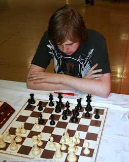 Above: Scottish junior, Calum McQueen, playing on top board in Rd. 10 of the Major Open. The party hat did him no good at all as he lost to Robert Eames.