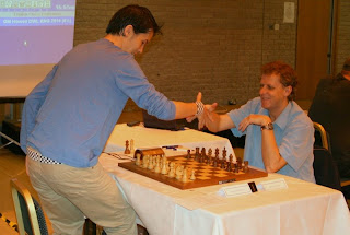 So things went as predicted - more or less. On Bd. 1, Gary Lane showed his hand by offering a draw after move 6. Howell declined, perhaps hoping to go out with a further win, but when the position soon became a bit turgid and would have required a lot of time and effort to resolve, he clearly came to the conclusion that the easiest option was probably the best after all. Furthermore, he was due to play in the 1st round of the Staunton Memorial in London the next afternoon, so it made good sense to conserve his energy.