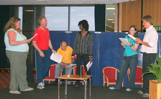 It was, in fact, a murder mystery play put on by Arbiter Kevin Stavely, using 6 volunteer actors from the enormous cast of players and hangers-on, only too keen to strut their stuff on stage. The script is provided by a company and all the actors have to do is to familiarise themselves with the words and actions required, and deliver them with some kind of conviction before a paying audience, who have to guess who did what to whom, when and why. A goodly number stumped up their 50p admission charge and a good time was had by all. In a typical drawing room denoument, it emerged that Alan Burke had poisoned Peter Hale.