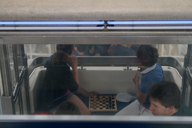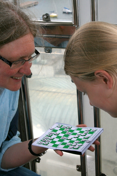 At 3 p.m. there were 30 people assembled at the entrance to the wheel, carrying a variety of sets & boards, from the neatest small magnetic sets to a big floppy board. Stewart Reuben took names and pairings, and then the thing started. However, it soon became clear that there had been a misunderstanding; Stewart thought he’d wangled free use of 3 or, at best, 4 circuits of the wheel, but the company had, in fact, pencilled them in for a whole hour! Fine for the players - not so good for the photographer who had no opponent and no head for heights.