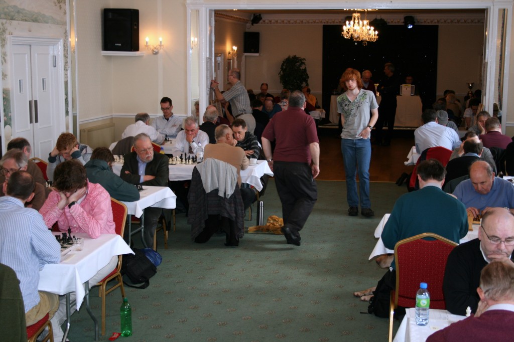 On arrival, the Arbiters were busy re-arranging all the tables, from the traditional 6 rows of 2, to four rows of 3 across the room. This has the effect of narrowing the through gangway, but allowing much more room behind each chair, which has always been a problem at this venue. It worked well throughout the final round. So after 12 years at this hotel, a new layout has been stumbled on. The blindingly obvious is not always so easily spotted.