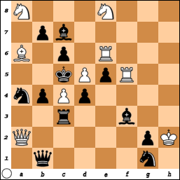 This week’s position is the end of a game between Colin McNab and Jim Sherwin (Black). White is faced with the threat of dxe1=Q+, but how concerned should he be? Does he have sufficiently powerful counter- threats?