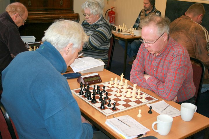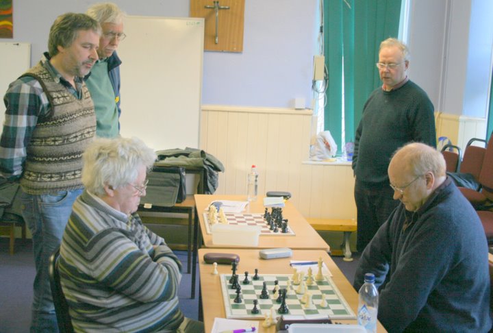 First game to finish was Knowles (W) v Jones, in which an early foray by the White queen resulted in its being harried, in turn leading to Black gaining space on the queenside and the initiative, after which material started to drop. 0-1 to the visitors.