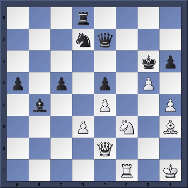 1.c4 d6 2.Nc3 e5 3.d3 Nf6 4.Nf3 Be7 5.g3 c6 6.Bg2 Bg4 7.0–0 0–0 8.a3 a5 9.Rb1 Qc7 10.b4 axb4 11.axb4 Nbd7 12.Qd2 h6 13.Bb2 Be6 14.e3 d5 15.cxd5 Nxd5 16.Nxd5 Bxd5 17.Rfc1 f6 18.e4 Be6 19.Nh4 Kh7 20.f4 Bd6 21.f5 Bf7 22.Nf3 Ba2 23.Ra1 Qb6+! White overlooked this check, which wins a pawn. 24.Kh1 Bxb4 25.Qe2 c5 However, White soon has a trick to win it back. 26.Bxe5 fxe5 27.Rxa2 Ra6 28.Rxa6 bxa6 29.g4 Qf6 Now materially level, but Black has an outside passed pawn with available support. White decides to act vigorously on the other wing in order to preoccupy Black from pushing his a-pawn. 30.h4 g5 31.fxg6+ opening lines to the Black king. 31…Kxg6 32.Rf1 Qe7 33.Bh3 a5 34.g5 Rd8 Diagram