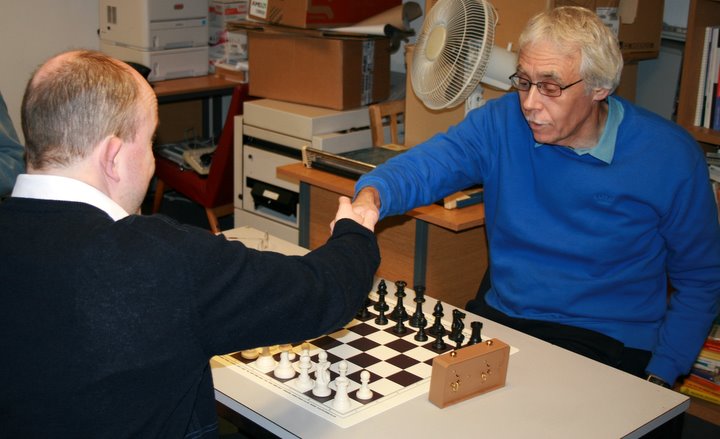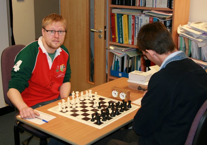 In the middlegame, Redman seemed to have a positional bind and merely needed to open the centre and exploit his advantage. However, he inadvertantly placed a piece on a bad square and Brusey could counter-attack. He went 2 pawns up and seemed sure to win himself. Material came off and with minutes to go, they were in a knight+pawns endgame. Redman’s knight perfomed minor miracles, winning 3 pawns and threatening to queen. From nursing a loss, to looking drawn, he was suddenly sniffing a win again. With the last seconds running out on the digital clocks, both sides queened and after a flurry of checks a draw was agreed. Nerves frayed all round, but honours even.