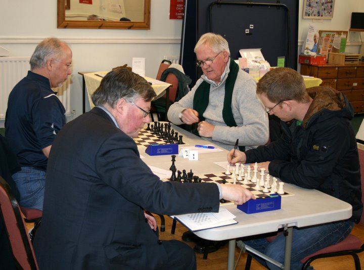 The maximum total grade for this match was 599, grades taken on the September 2011 grades (RapidPlay grade where appropriate), an average of just under 150 per board. Seaton’s team were all fairly close to this average, whereas Exmouth used Fred Hodge, relatively low-graded but vastly experienced and a safe pair of hands, on Bd. 4 to balance up the top 2 boards.