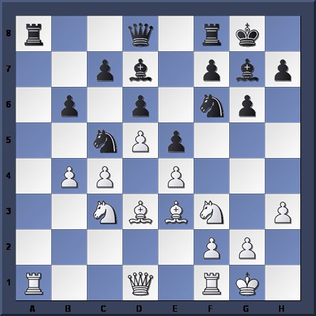 1.c4 g6 2.d4 Bg7 3.Nf3 d6 4.h3 Nf6 5.Nc3 Nbd7 6.e4 e5 7.d5 0–0 8.Bd3 a5 9.0–0 Nc5 10.Be3 b6 11.a3 Bd7 12.b4 axb4 13.axb4?? Diagram