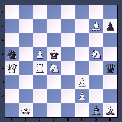 1.d4 Nf6 2.c4 e6 3.Nc3 Bb4 The key moves of the Nimzo-Indian Defence, one of Black’s most dangerous replies. 4.Nf3 b6 Black switches to a Queen’s Indian system. 5.Bg5 Bb7 6.e3 0–0 7.Bd3 d6 8.0–0 Nbd7 9.Nd2 Bxc3 10.bxc3 c5 11.f4 Qc7 12.Rc1 Rfe8 13.Qe1 h6 14.Bh4 Rac8 White decides to change his plan of an attack down the f-file to one of a more general spatial advantage. 15.e4 e5 16.fxe5 dxe5 17.d5 Qd6 18.Rf3 Nh5 The idea is to get this knight to f5 via e3. 19.Nf1 Nf4 20.Bc2 Ba6 21.Ne3 g6 Denying f5 to the knight. 22.Rb1 Rf8 23.Kh1 Kh7 24.Qd2 g5? Vacating f5 and opening up the white-square diagonal. Better is 24…f6. 25.Bg3 White is now thinking about an attack based on the moves Nf5 - BxN - Rh3, bearing down on Black’s backward h-pawn. 25…Nf6? 26.Bxf4 Black finally cracks. exf4?? 27.e5+ winning the queen. 1–0. However, even if Black had played the alternative 26…gxf4 after 27.Rxf4 the pin prevents Black retaking Ng8 28.Nf5 etc. Black would still have struggled to save the game.