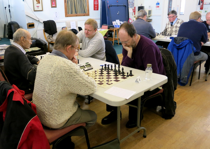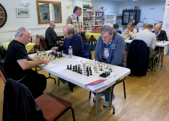Having been the first of the 5 teams involved to have a bye, Exmouth’s first match in the Bremridge Cup (Div. 1) did not come till after Christmas, when they hosted Tiverton. The whole story was one of near disaster from beginning to end. The Tiverton team was already weakened when their Bd. 1 player, Dave Littlejohns, suddenly discovered there were no trains between Taunton and Exeter that day due to major works on the track and he wouldn’t be able to make alternative arrangements. Brian Hewson phoned back to offer a lift, but there was no reply from the land line and he had no mobile number. In the end he went to the house in the hope that Littlejohns would be there, which he was, and the pair arrived in Exmouth shortly before the 2.30 start, with jangling nerves.