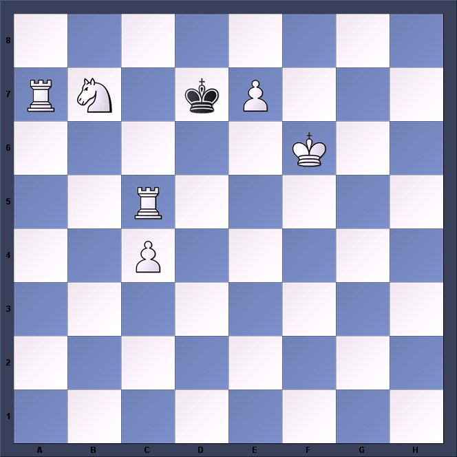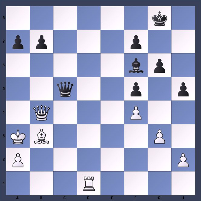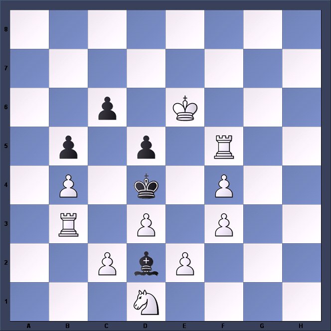 1.d4 d5 2.c4 c6 3.Nf3 Nf6 4.e3 Bf5 5.Nc3 e6 6.Nh4 Bg6 7.Qb3 Qc8 8.Bd2 Nbd7 9.Rc1 a6 10.Be2 Bd6 11.0–0 Qb8 12.g3 Ne4 13.Nxe4 Bxe4 14.Bb4 0–0 15.f3 Bg6 16.Nxg6 hxg6 17.Rfd1 Nf6 18.Kg2 Bxb4 19.Qxb4 Qc7 20.a4 a5 21.Qb3 Rfe8 22.f4 Rad8 23.Bf3 Qe7 24.c5 Qc7 25.Qc3 Ra8 26.Rb1 Ra7 27.b4 axb4 28.Rxb4 Rea8 29.Qb3 Nd7 30.Rb1 Rb8 31.g4 f6 32.Qc2 Kf7 33.Be2 Rh8 34.Qb3 Rb8 35.Qd3 Rh8 36.Qb3 Rb8 37.Bd1 g5 38.fxg5 fxg5 39.Bc2 Nf6 40.Rf1 Rh8 41.h3 Ke7 42.Bg6 Rh6 43.Qb1 Qd7 44.Rf2 Kd8 45.Rfb2 Kc8 46.Bd3 Qc7 47.Qd1 Kb8 48.Qe2 Ka8 49.Rb1 Rh4 50.Rf1 Ra5 51.Rh1 e5 52.e4 White has 2 minutes left for all his moves yet must avoid losing or the team will miss a vital win. No pressure, then. 52…dxe4 53.Bxe4 exd4 54.Bf3 Qf4 55.Rd1 Rxc5 56.Rdxd4 Qc1 57.Rd8+ Ka7 58.Rbd4 Rc2 59.Rd2 Rxd2 60.Rxd2 Qc5 61.Rb2 Nd5! Having remained stationary for 44 moves the knight springs to the rescue. White sees the threatened fork on f4 but not the even greater danger on h6. 62.Qd2 Nf4+ 63.Kh2 Rxh3# 0–1