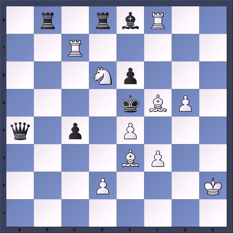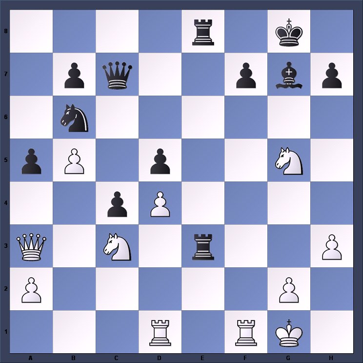 1.g3 c5 2.Bg2 g6 3.e4 Bg7 4.Nc3 Nc6 5.d3 The position has evolved into the Closed System in which White declines to open up with d4. 5…e6 6.f4 Nge7 7.Nf3 0–0 8.0–0 d6 9.Be3 Nd4 10.e5 dxe5 11.fxe5 Nef5 12.Bf2 Nxf3+ 13.Bxf3 Qc7 14.Ne4 Bxe5 15.Bxc5 Bd4+ 16.Bxd4 Nxd4 17.c3 Nxf3+ 18.Qxf3 f5? The f-pawn can’t actually take the knight at the moment and it leaves behind the e-pawn which will become problematic. 19.d4 Bd7 20.Nc5 b6 21.Nxd7 Qxd7 22.Rae1 Rfe8 23.Re5 Blockading the backward e-pawn, which will become increasingly difficult to defend once White’s heavy pieces gang up on it. This future problem leads Black to overlook present realities. 23…Re7?? 24.Qxa8+ 1–0.