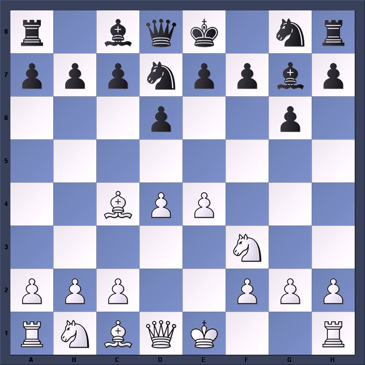 1.d4 d5 2.c4 e6 3.Nc3 Nf6 4.Bg5 Nbd7 5.cxd5 exd5 6.e3 c6 7.Bd3 Be7 8.Nge2 Nh5 9.Bxe7 Qxe7 10.Qc2 g6 11.0–0–0 Nb6 12.Kb1 Ng7 13.e4 dxe4 14.Bxe4 Black has to decide whether to risk castling on the kingside and inviting a pawn storm. However, if he castles long, White threatens to break open the centre with d5. 14…0–0 15.Nf4 Qf6 16.g3 Ne6 17.Nce2 Ng5 18.Bd3 Bg4 19.h3 Bf3 20.Rhf1 Rad8 21.h4 Ne6 22.Nxe6 Qxe6 23.Rd2 Qf6 24.Qc3 Rfe8 25.h5 White pushed on with his attack, but Black is able to create counter threats. 25…Nd5 26.Qb3 Qg5 27.Rc2 Qxh5 28.Nc3 Nxc3+ 29.Qxc3 Qg4 30.Rd2 Qxd4 Black is able to grab another pawn to open up the central files, while White’s pieces are not well co-ordinated. 31.Qxd4 Rxd4 32.Kc2 Red8 33.Re1 Bg4 preparing for the killer blow. 34.Kc3 Bf5 0–1 White can avoid losing a piece, with 35.Re8+ Rxe8 36.Kxd4 Rd8+ 37.Ke3 Rxd3+ 38.Rxd3 Bxd3 39.Kxd3. but is left a pawn down on both wings.