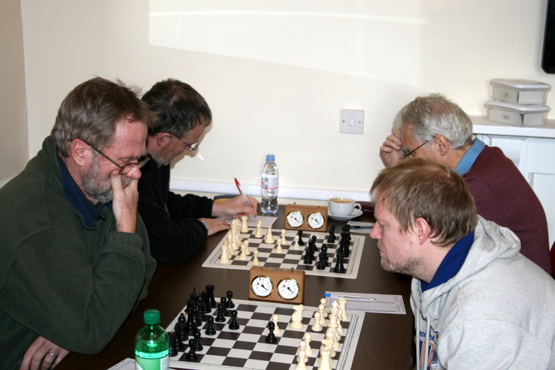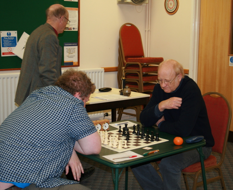 Steve Martin’s was the first game to finish. He has the habit of turning up, winning in little over an hour, before going back home immediately. No-one’s complaining, as this immediately puts pressure on the opposition. Then Jonathan Underwood got a draw against the dangerous junior, John Fraser, followed by another win, this time for Chris Scott who made no mistakes and took full advantage of a couple of slight misjudgments by his opponent. This was balanced by a loss by John Stephens who had Black, and failed to get satisfactory counter-play against Mackle’s opening.