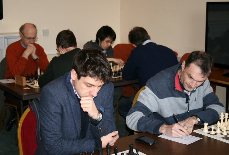 This left Bds. 5 & 6 to decide the outcome. Gosling had had something of a harum-scarum game, losing a piece but winning 2 significant pawns by way of compensation. In the end he was able to force a perpetual check with his queen. 3 points in the bag. However, Oliver Wensley’s position looked pretty watertight, and was never in danger of losing, unless he blundered. He offered a draw, but knowing that to accept would mean losing the match Kinder declined. A few moves later he consulted with his captain before accepting the draw, possibly in order to avoid the prospect of a 4-2 loss or to get back home at a respectable hour.