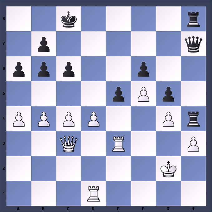 In last week’s position, Richard Smith won after a rook sacrifice and this series of forcing checks. 1…Rxg4+! 2.hxg4 (2.Kh2 is no better) Qh2+ 3.Kf1 Qh1+ 4.Ke2 Rh2+ 5.Kd3 Qxd1+ 6.Ke4 Qxg4+ 7.Kd3 Qxf5+ 0-1
