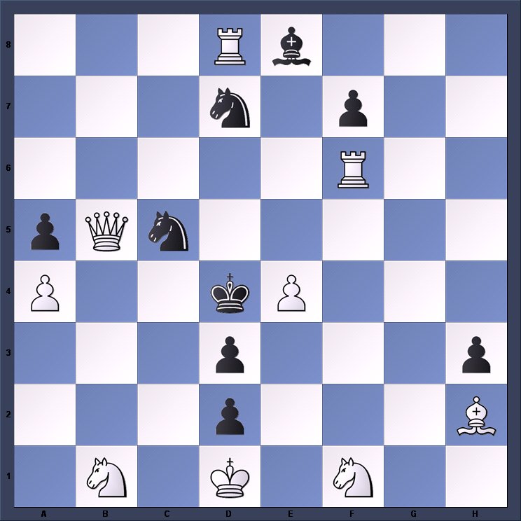 1.e4 c6 2.d4 d5 3.Nd2 dxe4 4.Nxe4 Nd7 5.Ng5 Ngf6 6.Bd3 Nb6 7.N1f3 Bg4 8.Qe2 Bh5 9.h3 h6 10.g4 hxg5 11.gxh5 Rxh5 12.Nxg5 Qxd4 13.Ne6 Qd6 If 13…fxe6 14.Bg6+ disturbing the king and winning a rook, which looks a horror show for Black but after 14…Kd8 15.Bxh5 Nxh5 16.Be3 Qb4+ 17.c3 Qb5 18.Bxb6+ axb6 19.0–0–0+ Kc7 20.Qxe6 and Black has 2 minor pieces for a rook, often an advantage, depending on where the pieces in question are situated. This game is a good example of that. 14.Bf4 Qxe6 15.Qxe6 fxe6 16.Bg6+ Kd7 17.Bxh5 Nxh5 18.0–0–0+ Ke8 19.Be5 g6 20.Rhg1 Kf7 21.Rd4 Now Black’s pieces spring into action. 21…Bh6+ 22.Kd1 Nf6 23.c4 Nbd7 24.Bxf6 Nxf6 25.Re1 Rh8 26.Kc2 Bg7 27.Rd3 Rh4 28.b3 Rf4 29.Re2 Ne4 30.Rd7 Nc5 31.Rd1 a5 32.Rh1 Bd4 33.Rh2 g5 34.Rg2 Bf6 35.Rg4 Rf5 36.a3 e5 37.b4 axb4 38.axb4 Ne6 Threatening Nd4+. 39.Kc1 Nf4 40.Ra2 b5 41.cxb5 cxb5 The knight is ready to mop up White’s pawns via d3 or h3. 0–1