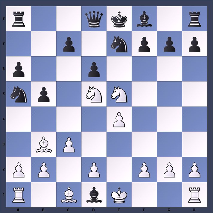 Ruy Lopez – Modern Steinitz Defence. 1.e4 e5 2.Nf3 Nc6 3.Bb5 Nge7 A variation favoured by Steinitz, it being one of his many attempts to establish a valid defence to the Lopez attack. 4.0–0 Probably stronger would be 4.Nc3 and eventually d4 reserving the option of castling on either side at a later stage. 4…d6 5.d4 a6 6.Ba4 Using wide discrimination in not exchanging pieces and queens, as it would rather be to Black’s advantage to remain with his king in the centre. 6.Bxc6+ Nxc6 7.dxe5 Nxe5 8.Nxe5 dxe5 9.Qxd8+ etc. Possibly some would prefer 6.Bc4 for if Black continues 6…b5 7.Be2 and Black’s queenside would be weak. 6…b5 7.Bb3 Bg4 A distinct error. The only continuation from this point giving Black a playable game is 7…Nxd4 8.Nxd4 exd4 9.Qh5 (not 9.Qxd4 c5 and …c4 wins.) 9…Ng6 for if 10.Qd5 (or if 10.f4 Be7 11.Bxf7+ Kxf7 12.f5 Bf6 13.fxg6+ hxg6 14.Qd5+ Be6 15.Qxd4 Kg8 and White has no advantage.) 10…Be6 11.Qc6+ Bd7 drawn. 8.Bxf7+ Better than 8.dxe5 Bxf3 (Of course, if Black plays 8…Nxe5 White wins by 9.Nxe5) 9.Qxf3 Nxe5 10.Qg3 etc. 8…Kxf7 9.Ng5+ Kg8 Bad, although after 9…Ke8 10.Qxg4 Nxd4 11.Na3 (safest). Also, White can venture 11.Nc3; 11.Ne6 might easily lose as follows: 11…Qd7 12.Nxg7+ Bxg7 13.Qxg7 Rg8 14.Qxh7 Rxg2+ with a winning game. 10.Qxg4 Qc8 If now 10…Nxd4 11.c3 h5 12.Qh3 Ne2+ 13.Kh1 Qc8 (if 13…Rh6 14.Ne6 and wins.) 14.Qf3 Nf4 15.g3 winning a piece. 11.Qf3 Qe8 12.Qb3+ d5 13.exd5 g6 For Black’s obvious reply was 13…Nxd4 although even then White should win being a pawn ahead and positional advantage. 14.dxc6+ Kg7 15.Ne6+ Kf6 The mate following or decisive win of material is forced. 16.Bg5+ Kf5 17.Qh3+ Ke4 18.Qf3# 1–0