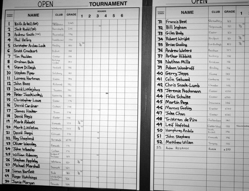 If ever a sign were needed of the enduring popularity of this Exeter-based event, in spite of its financial problems of recent years, the entry of 53 in the Open was surely it, in spite of the fact that the Committee always seem to issue their entry forms much later on than most congresses - often a matter of weeks rather than months. The list of entries, (see below) shows much more than the “usual suspects”, but an eclectic mix, with a good sprinkling of new faces. Russia and Norway appear in the Club column; there’s a significant Cornish contingent; Devon ex-pats returning to the fold (e.g. Piper - Holsworthy// Shapland & Hutchings - Barnstaple // Lowe - Paignton), not to forget former Kenyan Champion, Humphrey Andolo.