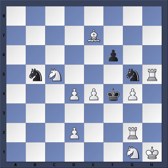 1.d4 d5 2.c4 e5 The Albin Counter Gambit, a provocative reply to the Queen’s Gambit. 3.e3 c5 4.cxd5 cxd4 5.Bb5+ Bd7 6.Bxd7+ Qxd7 7.exd4 Qxd5 8.dxe5 Qxe5+ Best. If 8…Qxg2 9.Qf3 Bb4+ 10.Ke2 Qxf3+ 11.Nxf3 9.Qe2 Qxe2+ 10.Nxe2 Nc6 11.0–0 0–0–0 12.Nbc3 Nf6 13.Bg5 Be7 14.Rad1 Rhe8 15.Rfe1 h6 16.Bh4 g5 17.Bg3 Bb4 18.f3 Bc5+ 19.Bf2 Bxf2+ 20.Kxf2 g4 21.Ng3 Rxe1 22.Rxd8+ Kxd8 23.Kxe1 Now there are just the 4 knights left. 23…Kd7 24.Ke2 Ke6 25.Ke3 a6 26.Nce4 Nd5+ 27.Kf2 gxf3 28.Kxf3 Ne5+ 29.Ke2 b6 30.Nh5 Kf5 31.Neg3+? Much better was 31.Nhg3+. 31…Kg6 Now neither of White’s knights can move without the other being taken. Black shows an understanding of the subtleties of the position beyond her years. 32.Kf1 f5 33.Ng7 She correctly ignores the temptation just to grab the en pris knight. 33…Ne3+ 34.Ke2 f4 35.N3h5 Nxg2 36.Kf2 f3 37.Ne6 Kxh5 38.Nd4 Kg4 39.Nxf3 Nxf3 40.Kxg2 Ng5 41.b4 h5 42.a4 h4 43.b5 axb5 44.axb5 h3+ 45.Kf2 Ne4+ 46.Ke3 Nc30–1. White must lose his b-pawn and will be unable to ward off Black’s advancing pawns.