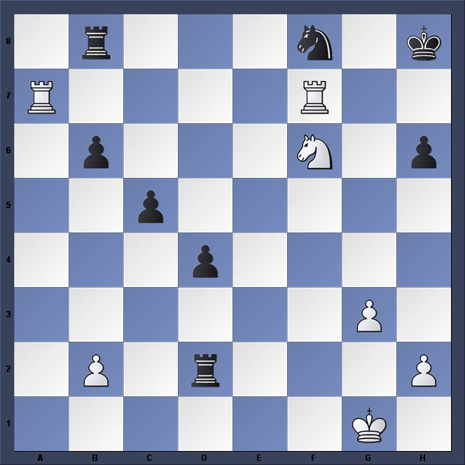 In last week’s position White won after 1.RxR+ Kf7 2. NxB+ Kf6 3.PxN=Q mate.