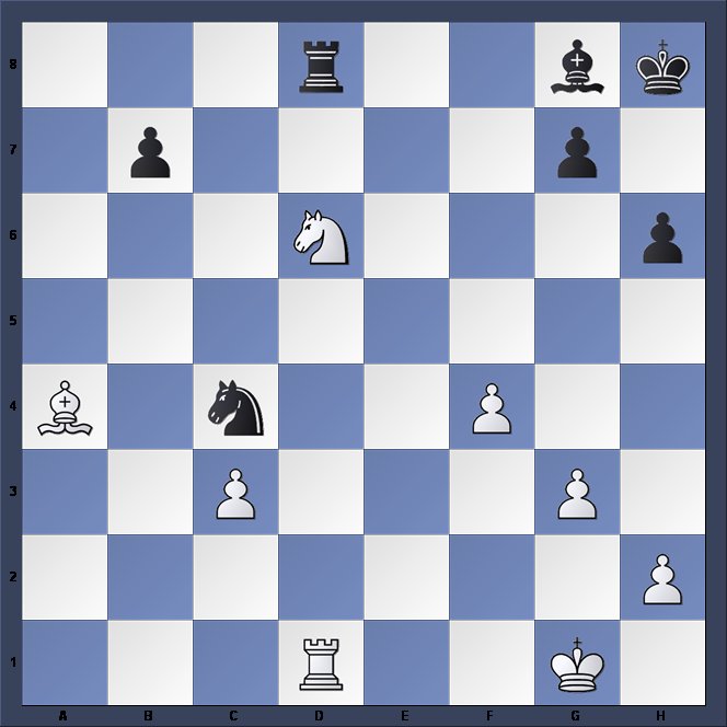 1.c4 e5 2.e3 g6 3.d4 d6 4.Nc3 Nd7 5.g3 Bg7 6.Bg2 Ne7 7.Nge2 0–0 8.a4 f5 9.a5 a6 10.b3 g5 This is what is called in the trade as a “pawn storm”, but what Black’s king might call a dereliction of defensive duties. 11.dxe5 dxe5 12.Ba3 c6 13.g4 f4 14.Be4 f3 15.Ng3 Black’s advanced pawns have achieved nothing, while his defences now leak like a colander. 15…Qxa5 16.0–0 c5 If 16…Qxc3? 17.Bxe7 wins Black’s g-pawn. 17.Bb2 Qb6 18.Bxf3 Nf6 19.Nce4 Ng6 20.Nxg5 Rd8 21.Qc2 Bxg4 22.Bxg4 Nxg4 23.h3 Nh6 24.Nh5 giving an extraordinary combination of knights on the wing. 24…Bh8 25.f4 Qc6 26.f5 Nf8 27.Rf2 Nf7 28.Ne4 Nd7 29.f6 Nf8 30.Kh2 Ng6 31.Rg1 Kf8 32.Rfg2 Ke8 33.Bc3 Kd7 34.Nhg3 Kc7 35.Rf2 Rd7 36.Qe2 Rg8 It’s a little late for this rook to be coming to the aid of the Party - the party’s almost over. 37.Qh5 h6 38.Rd2 Rxd2+ 39.Bxd2 b6 40.Bc3 Qe6 41.Nf5 Ng5 42.Nxh6 The rook must move away, leaving both knights undefended. 1–0