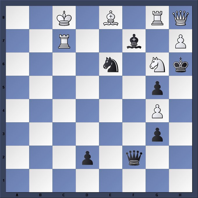 The solution to last week’s position (above) was 1…Qg3+ and if 2.hxQ Ng2 mate, while if 2.Rf2 QxR mate.