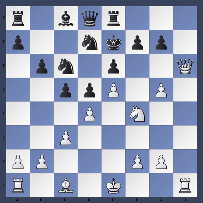 1.e4 Nc6 2.Nc3 Nf6 3.d4 d6 4.d5 Nb8 5.Bg5 c6 6.Nf3 Bg4 7.h3 Bxf3 8.Qxf3 Nbd7 9.0–0–0 Taking a considerable but calculated risk, as Black’s queenside pawns are well-placed to launch an attack at any time. But at least White has castled while Black still has some way to go. 9…Qc7 10.Be2 g6 11.Qe3 Bg7 12.Bh6 Bxh6 13.Qxh6 c5 14.Qe3 a6 15.f4 Before Black’s pawns can fully mobilise, White concentrates on the centre. 15…b5 16.Bf3 b4 17.Ne2 Rb8 18.g4 h6 19.h4 Completing an impressive array of advanced kingside pawns, forcing Black to divert his attention away from his own plan of attack. 19…h5 20.gxh5 Nxh5 21.Bxh5 Rxh5 22.Ng3 Rh7 23.e5 dxe5 24.f5 Nf6 25.fxg6 fxg6 26.Qg5 Kf7 27.Rhe1 e4 28.Nxe4 Rh5 29.d6! Best. White is not to be diverted, as the centre is rapidly breaking open to his advantage. 29…Qc6 If 29…Rxg5? 30.Nxg5+ Ke8 31.dxc7 Ra8 32.Ne6 Black has lost a rook and White threatens 38.Rd8=Q+. 30.Qf4 Rf5 31.Ng5+ 1–0 Play might have continued… Kg8 32.Qc4+ Rd5 33.dxe7 Re8 34.Rxd5 Qxd5 35.Qxa6 Kg7 36.Ne6+ with the deadly fork 37.Nc7 to follow.