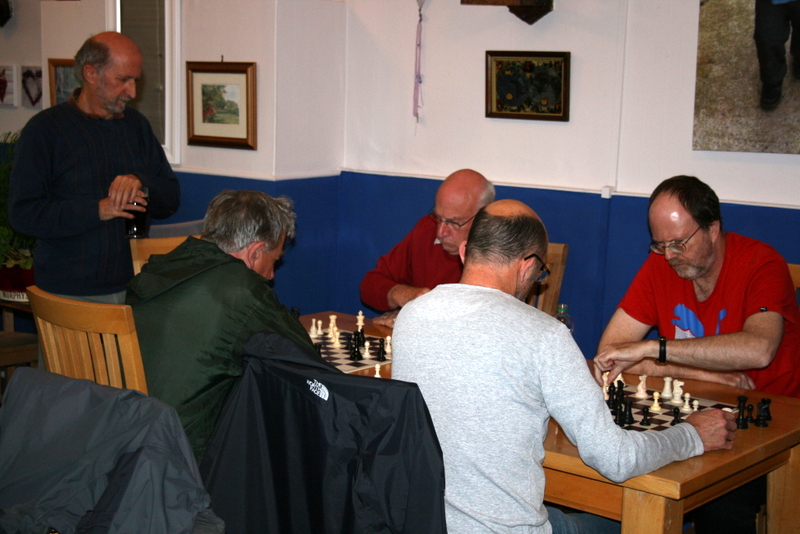 The Organiser, Mark Hassall, (standing centre) having enjoyed a quick win, takes time to monitor the progress of his Cornish team-mates. The nearest game involves clubmates Brian Gosling (B) vs Oliver Wensley (partly obscured) Brian Gosling