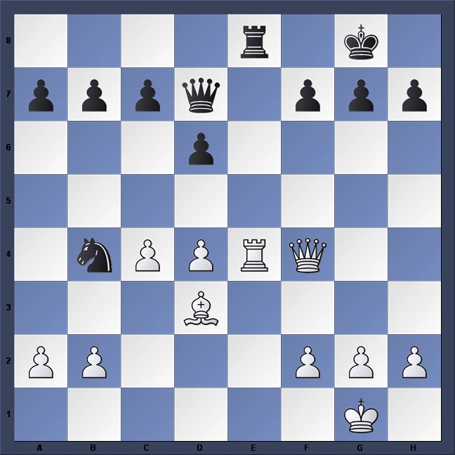1.e4 Nf6 Alekhine’s Defence, in which Black tries to lure Black’s pawns forward to a point where they become unstable and can be more easily attacked, as White will by then have neglected his piece development. 2.e5 Nd5 3.d4 d6 4.f4 dxe5 5.fxe5 Nc6 6.c4 Nb6 7.Be3 Bf5 8.Nf3 e6 9.Nc3 Qd7 10.Be2 0–0–0 11.Qd2 Be7 12.0–0–0 Nb4 13.a3 Nc2 Black has succeeded in getting in behind White’s front lines 14.c5 But the White pawns press ahead anyway. 14…Nxe3 15.cxb6 Nxd1?? Black sees only the chance of going a whole rook up, but completely overlooks his defences. 16.bxa7 c5 17.a8Q+ Kc7 18.Qa5+ 1–0.