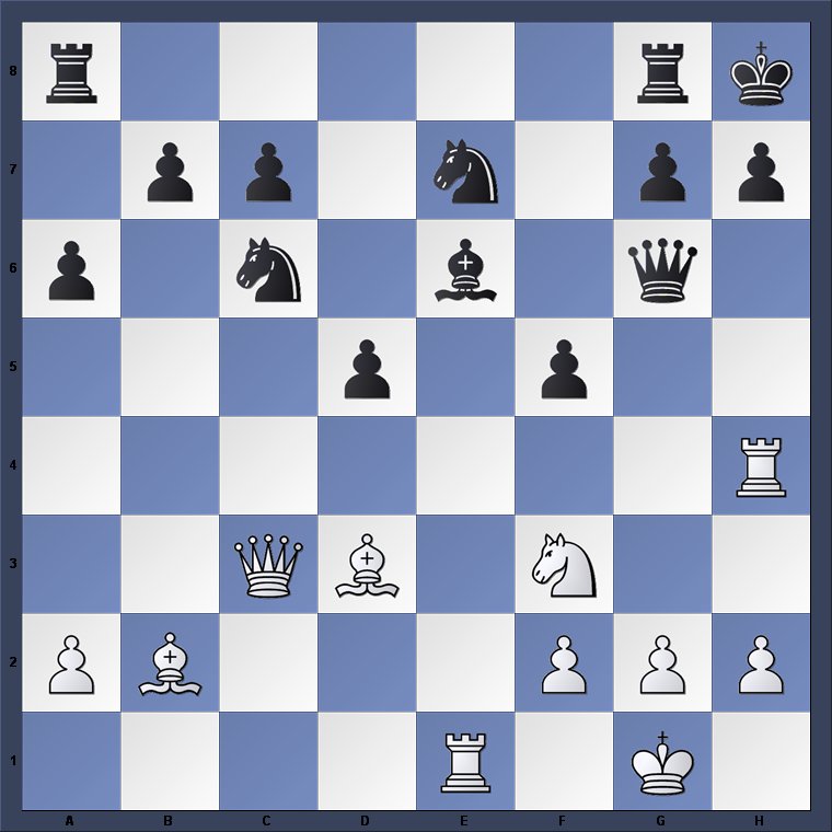 1.e4 Nh6 2.d4 Nf7 Philidor follows his normal plan of occupying the centre with pawns and developing pieces in support. 3.f4 e6 4.Bd3 c5 5.c3 cxd4 6.cxd4 Nc6 7.Nf3 Bb4+ Annoying, as White is without his knight to block the check 8.Ke2 Qc7 9.a3 Be7 10.Be3 d6 11.b4 Bd7 12.Rc1 Qd8 Black is already finding it difficult to find good squares for his pieces. 13.h3 Rc8 14.g4 Nb8 15.Qd2 Rxc1 16.Rxc1 d5 17.e5 a6 18.f5 h6 19.fxe6 Bxe6 20.Bf5 Bxf5 21.gxf5 Bg5 22.e6 Bxe3 23.exf7+ Kxf7 24.Qxe3 Re8 25.Ne5+ Kg8 26.Qf4 Qf6 27.Kf3 Rf8? 28.Ng6! Re8 29.Qe5! Qxe5? 30.dxe5 The exchange of queens works in White’s favour as it unites his forward pawns. Nc6 31.Kf4 Kf7 32.Rd1 d4 33.h4 Rd8 34.Ke4 b5 35.h5 a5 Desperation – he has little else to do. 36.Rc1 d3 This brings us to this week’s diagrammed position. Black has a freely advancing pawn backed by a rook, so will our hero have time to take the undefended knight? What will he do?