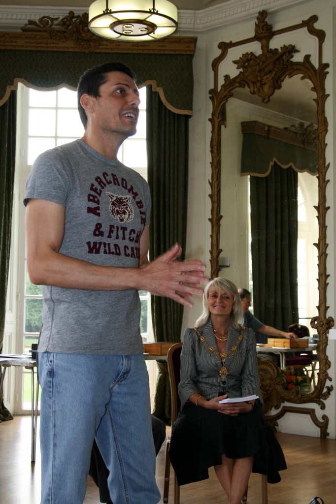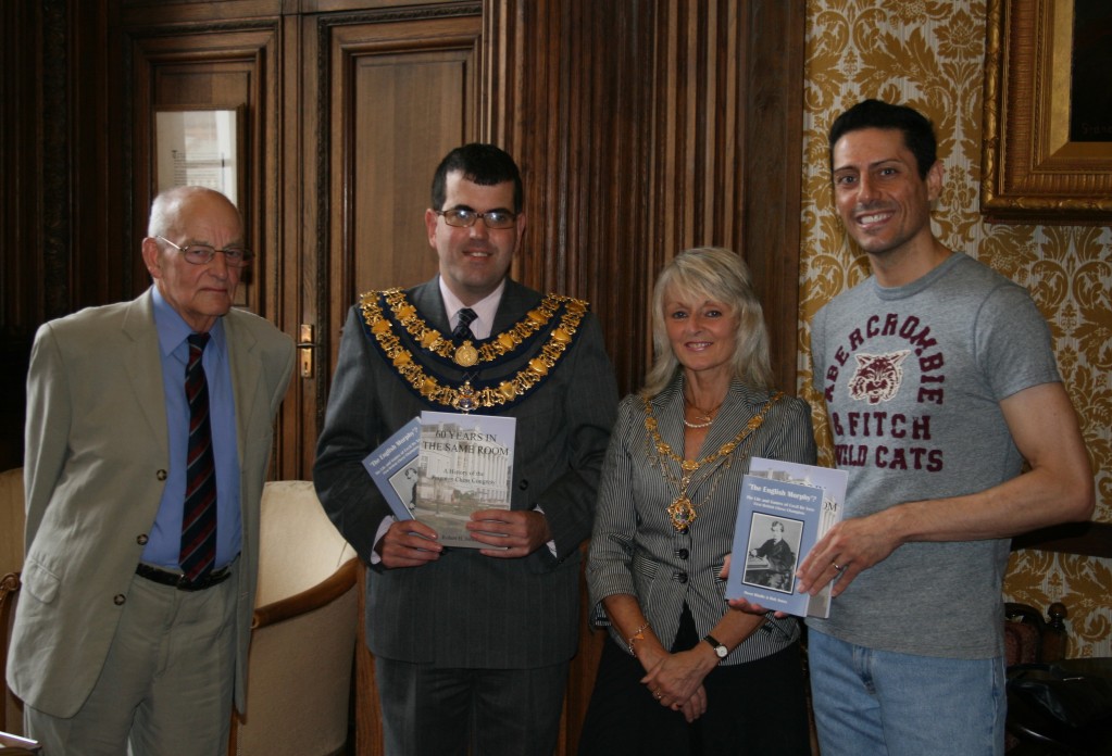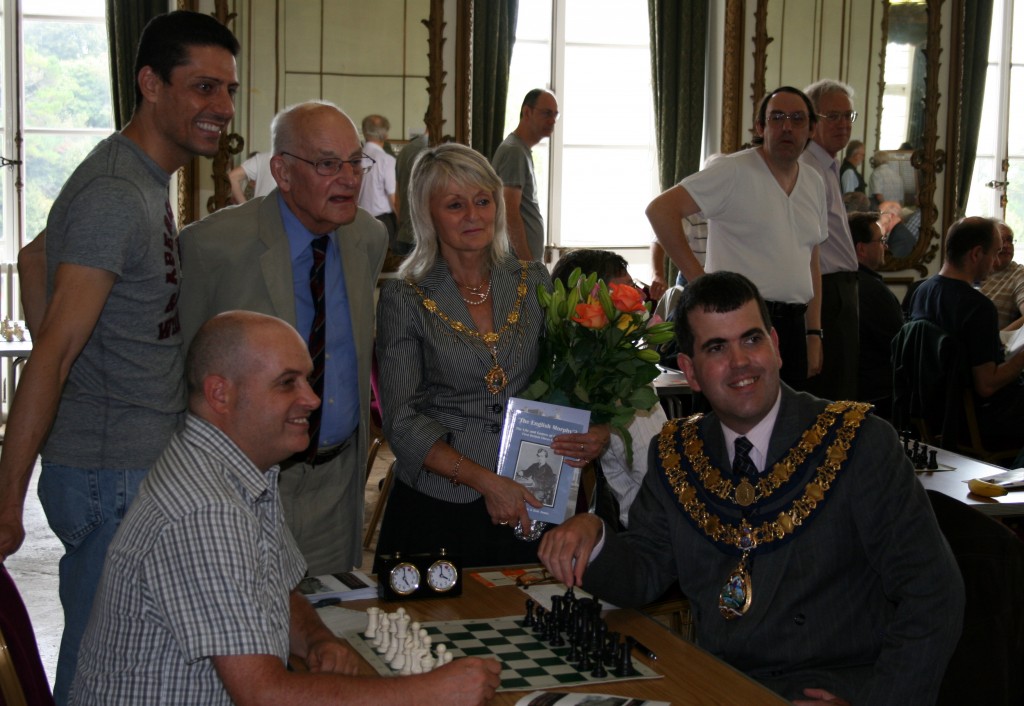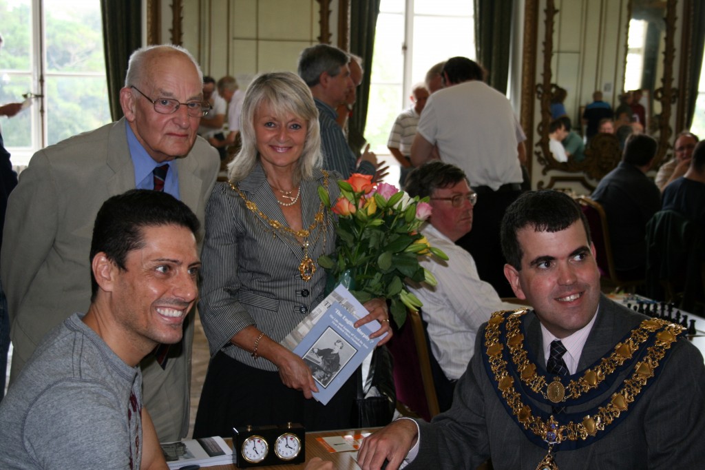 Chief guest, however, was C. J. de Mooi, of the Eggheads team on TV and now ECF President. He arrived on time after a 3 hour drive down and at 1.30 p.m. we gathered in the Mayor’s Parlour to rendezvous with Cllr Philips, the Chairman of the Torbay Council and his Escort, Cllr. Nicole Amil, and Stephen Thorpe-Tracey, President of the Devon County Chess Association. This was an opportunity for Stephen to present both guests with inscribed copies of the Paignton book and my earlier book on Cecil de Vere, both with a Torbay connection. (see picture below)