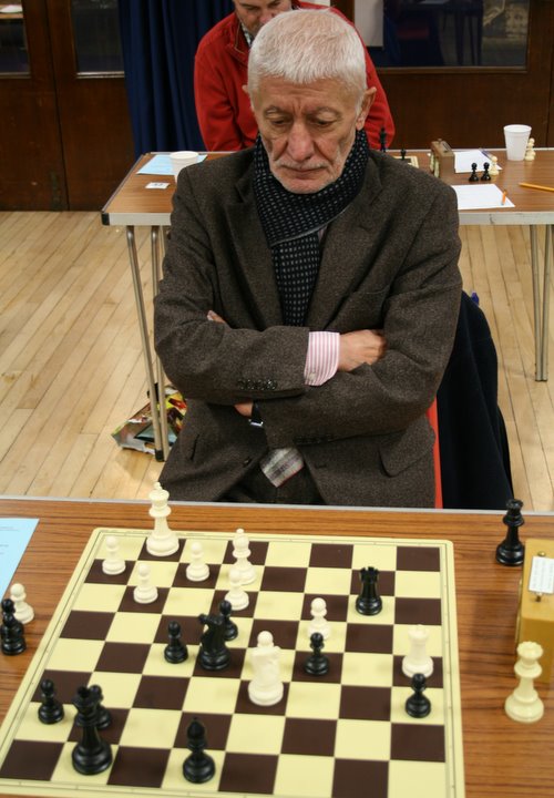 One of the more colourful characters in the match was Nijad Rahimili, like Exeter University student Hannah Dale, playing his first game for Devon. Born in Baku and now 75, and has, since his wife’s death recently, moved to Torquay to live near one of his two daughters who work in the UK (the other lives in Newcastle). He used to be the political correspondent on Azerbaijan for USSR television. He has rubbed shoulders with many of the Russian chess legends, and can tell many stories about them. In 1963, he commentated live on TV on the World Championship match bewteen Botvinnik and Petrosian, using a demonstration board.