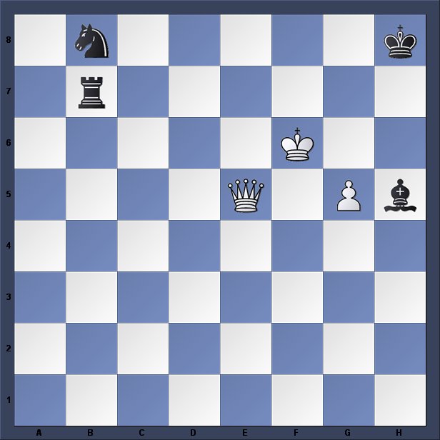 On this basis, the solution is 1.g6 Nd7+ forking king & rook. 2.Kf7+ NxQ+ 3. g7+ The point of this is that the White king is now attacked by three pieces and so is not in check as defined by the Laws as they then stood, which can only be 1 or 2 pieces. There now follows 3…Kh7 4. g8=Q Kh6 5.Qg7 mate