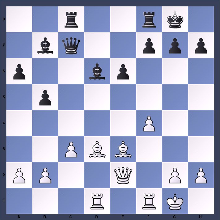 1.d4 Nf6 2.c4 c5 3.d5 e6 4.Nf3 exd5 5.cxd5 d6 6.Nc3 g6 7.Bf4 Be7 A strange square for the bishop given that g6 has been played. Black may have been worried about his d6 pawn; however, there are a few ways to indirectly defend d6. 7…a6 8.a4 Bg7 9.e4 Bg4 10.Be2 0–0 11.0–0 Re8 12.Nd2 Bxe2 13.Qxe2 Nh5 14.Be3 Nd7 15.a5 Bd4 is considered the main line. 8.h3 0–0 9.e4 Qa5 10.Qd2 a6 11.Bd3 b5 12.0–0 b4 Black risks over-extending his pawns. 13.Nd1 c4 14.Bxc4 Nxe4 It looks appealing for Black to swap his c-pawn for White’s e-pawn, but the loss of time incurred gives White a clear advantage. 15.Qe2 f5 16.Nd2 g5 17.Be3 Nxd2? Black needs to develop his queenside. e.g. 17…Nd7 18.Nxe4 fxe4 19.Bd4 Bf6 20.Bxf6 Nxf6 21.Ne3 is still better for White, but the game is very much alive. 18.Bxd2 Bf6 19.a3 Qd8 20.axb4. More forcing for White was 20.Bxb4 a5 21.Bc3 Bxc3 22.Nxc3 with an overwhelming position. 20…Ra7 21.Ra3 f4 22.Re1 Re7 23.Qf1 Rfe8 24.Rxe7 Qxe7 25.Bc3 Bb7 26.b5 axb5 27.Bxb5 Rc8 28.Ra7 Bxc3 29.Nxc3 A pawn up with the more active pieces, White is more than happy to exchange material. 29…Rc7 30.Qd1 Nd7 31.Qd4 Qe1+ 32.Kh2 Ne5 1–0. Black lost on time, but Qb6 next move would have been crushing.