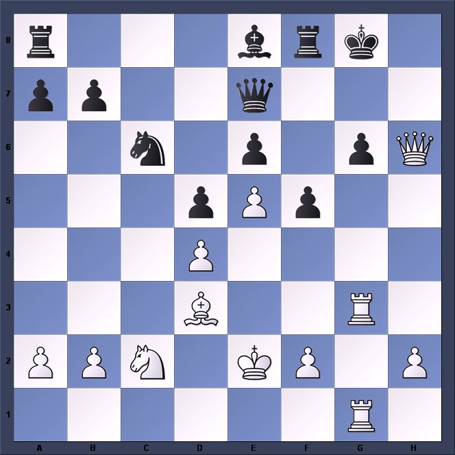 1.e4 e6 2.d4 d5 3.e5 c5 4.c3 Nc6 5.Nf3 Nge7 6.Na3 cxd4 7.cxd4 Nf5 8.Nc2 Be7 9.Bd3 0–0 10.g4 The idea is to sacrifice this pawn for an attack. 10…Nh4 11.Nxh4 Bxh4 12.g5 Bxg5 13.Qh5 h6 13…g6 wins a piece. 14.Qxg5 14.Rg1 Bxc1 15.Rxc1 f5 16.Qxh6 White had actually seen all this before and had used less than 5 minutes with Black having used 45. 16…Qe7? In Sveshnikov v Farago, Hastings, 1984, Black played 16…Rf7 which computer analysis puts as approximately level, whereas the text move loses. 17.Ke2 As often in the French, Black’s QB & QR are untouched when needed. 17…Bd7 18.Rg3 White’s attack is overwhelming. 18…Be8 19.Rcg1 White is now all poised and ready for the “big push”. 19…g6 which takes us to this week’s position. Can you work out the winning sequence of moves that took White to ultimate victory?