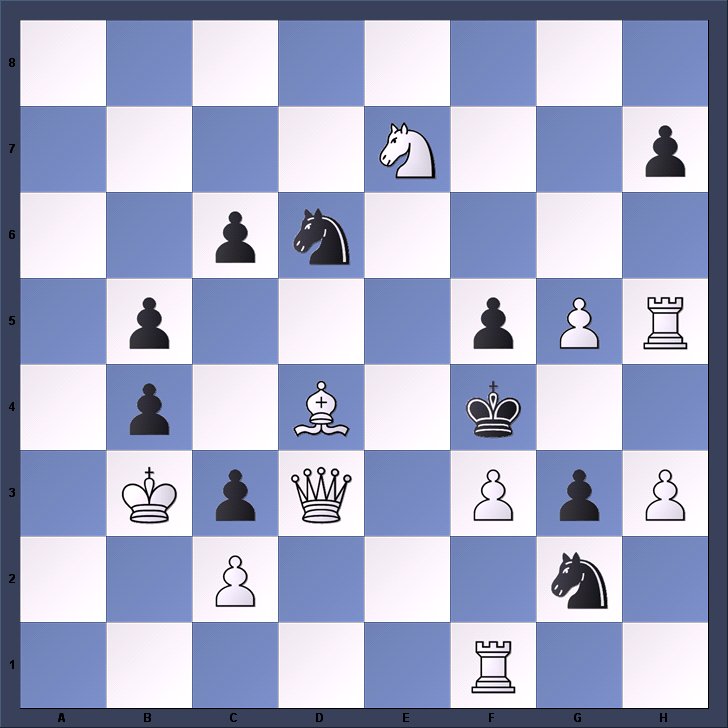 1.e4 Nc6 2.d4 e5 3.dxe5 Nxe5 4.f4 Nc6 5.Bc4 Bb4+ 6.c3 Ba5 7.Nf3 Bb6 8.Na3 d6 9.Qe2 Qe7 10.Bd3 Nf6 11.Nc4 0–0 12.Nxb6 axb6 13.0–0 Re8 14.Re1 d5 15.e5 Ng4 16.h3 Qc5+ 17.Kf1 Nh6 18.Be3 Qf8 19.Qc2 g6 20.g4 f5 21.exf6 Qxf6 22.f5 Nf7 23.g5 Qd6 24.Bf4 Nfe5 25.Nxe5 Nxe5 26.Qh2 Qf8 27.Rxe5 Rxe5 28.Bxe5 Bxf5 29.Bxf5 Qxf5+ 30.Kg1 Qxg5+ 31.Qg3 Qxg3+ 32.Bxg3 c6 33.a3 Kf7 34.Rf1+ Ke6 35.Bh4 Ra4 36.Bg5 Re4 37.Kf2 Kf5 38.Bd2 g5 39.Kg3+ Kg6 40.Re1 Rxe1 41.Bxe1 Kf5 42.Kf3 h5 43.a4 g4+ 44.hxg4+ hxg4+ 45.Ke3 Ke6 46.Bg3 Kd7 47.Kd4 Ke6 48.b4 Kd7 49.a5 c5+ 50.Kxd5 Kc8 51.Ke6 cxb4 52.cxb4 bxa5 53.bxa5 b5 54.a6 If 54.axb6 Kb7 ensuring a draw. 54…b4 55.Kd5 b3 56.Kc6 b2 57.a7 1–0.