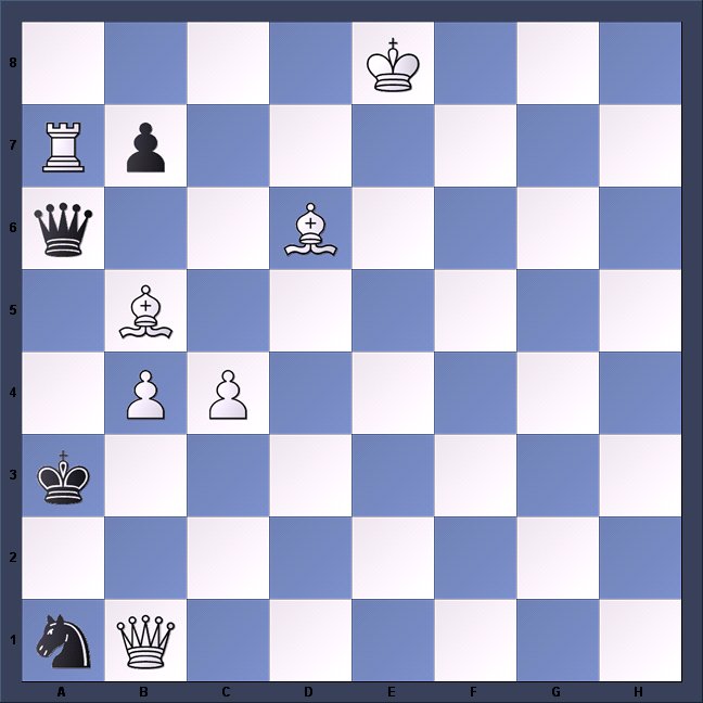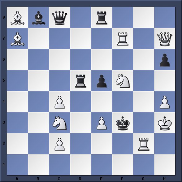 The British Solving Championship was held last weekend at Eton College and the new Champion is the Scottish GM Colin McNab (61/65 pts), followed by J. Mestel (59) and J. Nunn (56). The best non-seeded competitor was David Hodge. This 2-mover is one of the problems used in the competition.