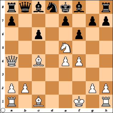 1.d4 Nf6 2.c4 e6 3.Nf3 b6 4.Nc3 Bb4 5.Bg5 Bb7 6.e3 Bxc3+ 7.bxc3 d6 8.Bd3 Nbd7 9.0–0 h6 10.Bh4 g5 11.Bg3 Ne4 12.Nd2