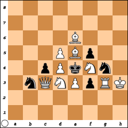 The knight looks poised to do some mischief but Black opts to continue the pawn storm. 12…f5 13.f3 13…Nxg3 14.hxg3 Qe7 15.e4 f4 16.e5 dxe5 17.Bg6+ Kf8 18.Qe2 fxg3! The mating net is closing in. 19.dxe5 Qc5+ 20.Kh1 Qxe5 21.Be4?? Necessary was 21.Qxe5 Nxe5 22.Be4 Rb8 23.Bxb7 Rxb7 24.Rae1 21…Qf4 0-1.It’s death on the dark squares - mate via h4, h2 and h1 is inescapable.