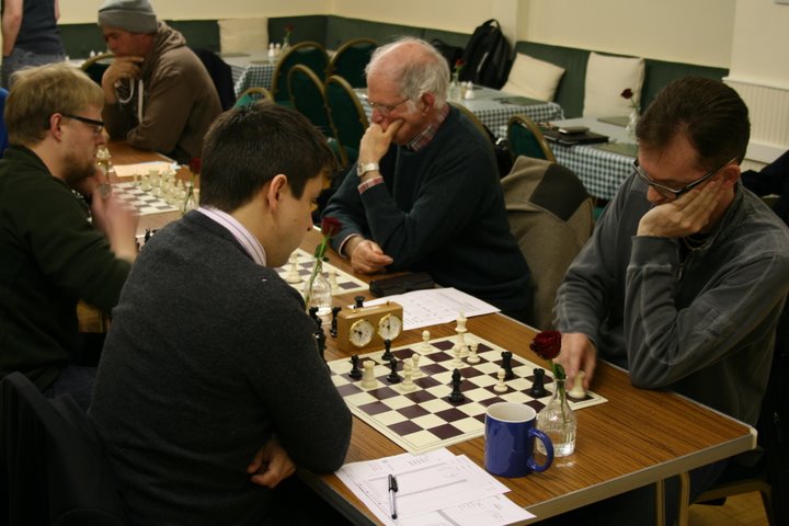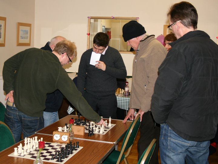 It is a commonplace that away matches to Seaton are held in the depths of winter, when the trip there has to be made during the rush hour, with a great wind blowing and rain thrashing down. Last night was no exception. Progress was slow and the venue was reached with only minutes to spare before the scheduled start of 7 p.m. However, on arrival, the venue was locked and the key-holder unobtainable as a group of chess-players and others huddled in the doorway. Eventually, she arrived and play started just a few minutes late.