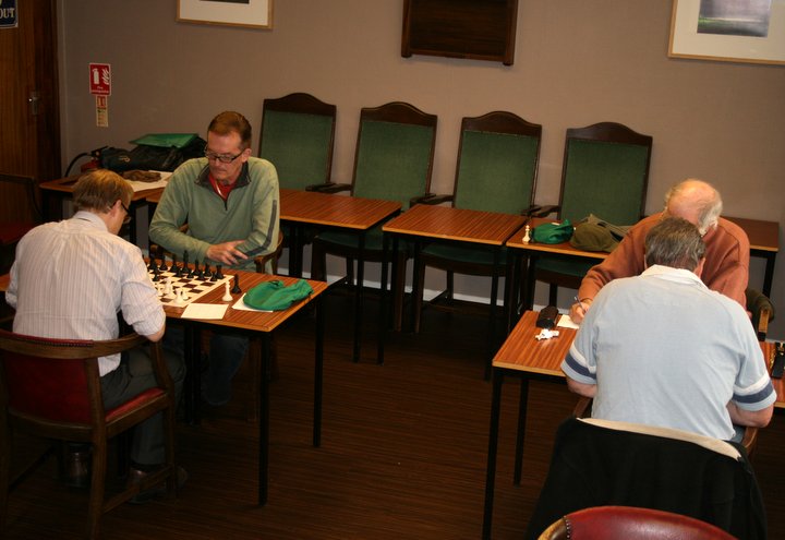 The maximum total grade for this match was 599, grades taken on the September 2011 grades (RapidPlay grade where appropriate), an average of just under 150 per board. Seaton’s team were all fairly close to this average, whereas Exmouth used Fred Hodge, relatively low-graded but vastly experienced and a safe pair of hands, on Bd. 4 to balance up the top 2 boards.
