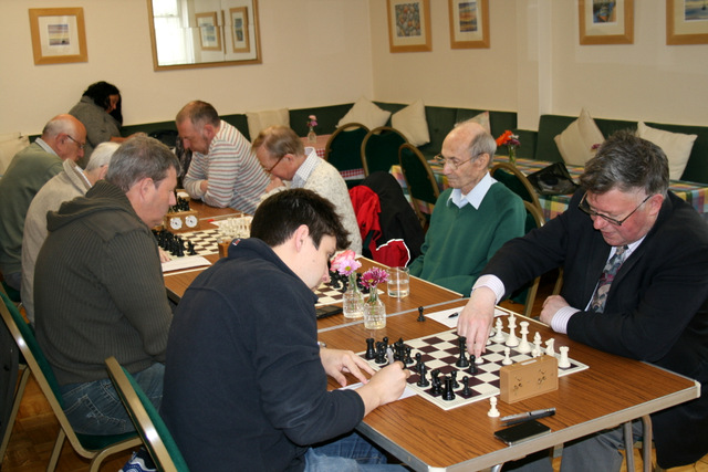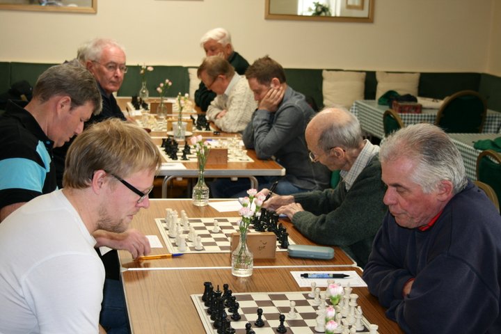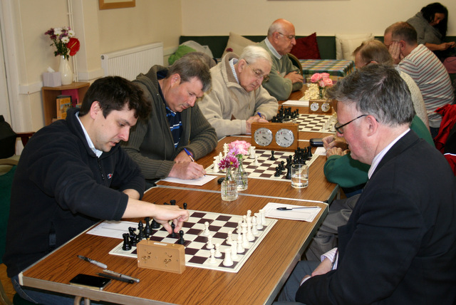 And so it turned out with hard-fought games on each board. The first three results were all draws, on Bds 4 (Thynne – Duckham), 5 (Kinder- Annetts) and 2 (Homer-Hewson). Only in the final hour, as the time control approached, did Newton Abbot’s players get on top, first on Bd 6 where Paul Brooks, playing an English Opening against Keith Atkins’ Dutch Defence, converted pressure into a material advantage. On Bd 3, perhaps the best game of the match, Alex Billings maintained his fine form this season and kept control in a complex position against Simon Bartlett. This settled the outcome of the match and a good day for the visitors was made better when Dominic Mackle showed exemplary endgame technique to defeat Ben Edgell on top board. So Newton Abbot retain the title of Devon’s top club. The league has been very interesting this year with 5 teams competing. It could be even better and more representative of all parts of the county if Plymouth (who certainly have the players on paper) and Barnstaple were to join in”.