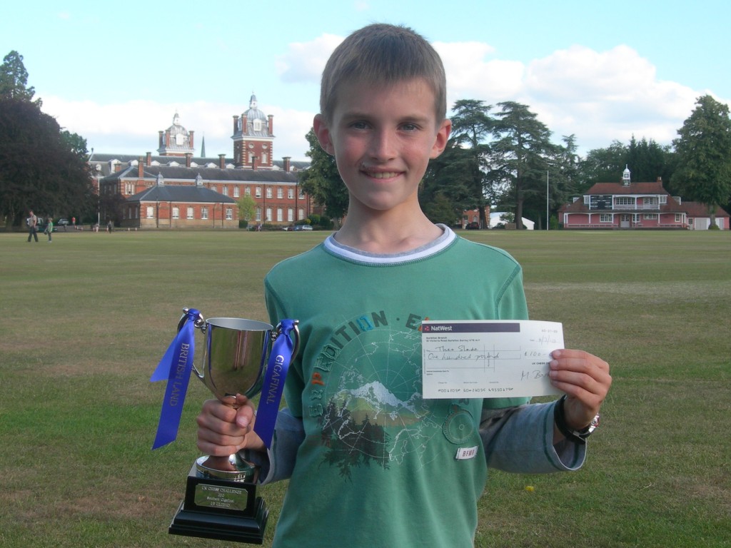 Continuing on from my blog of 3rd April 2010, young Theo Slade of Bude passed another milestone in his early chess career when he won the Boys U-9 B group at last weekend’s UK Chess Challenge Southern Area Gigafinal held at Wellington College, Berkshire. He got a trophy, cheque for £100 and goes forward to the ultimate final for all age groups, when the winners from the Southern and Northern regions play off for the national titles. This will be held in Warwick next month.