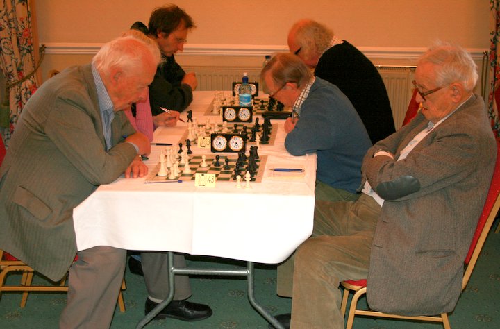 Ronnie Burton of Weymouth, a regular player both here and in the Autumn Seniors Congress, had to withdraw shortly before the event, but offered his entry fee to be awarded to the oldest player not to feature in the prize list. The two chief candidates were Robert Ryan and Heinz Herschmann. The German-born musician is 88 later this week, but Ryan reached that landmark a short while ago, so he gets the unexpected reward for longevity. By sheer coincidence they were paired in the final round.