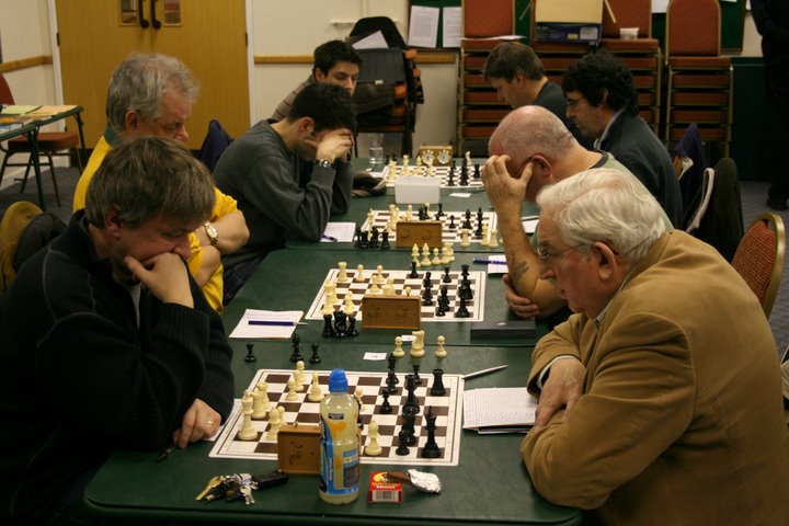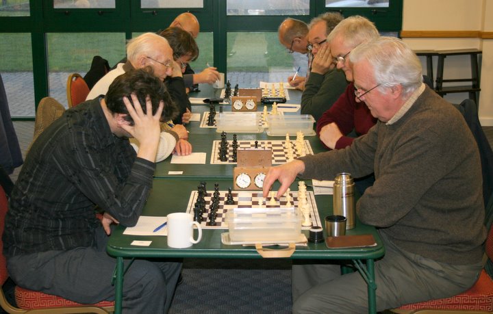 Players are matched according to the Hutton Pairing system, which ensures that although the teams are mixed up, the formula guarantees that, for example where 4 teams are involved, four players from any one team will play each of the other teams, and of those four, 2 will have the white pieces and the other two being black. And, where there is an even number of teams, all players will be matched with someone on the same board number as themselves. It’s complicated, but it works and it’s fair.